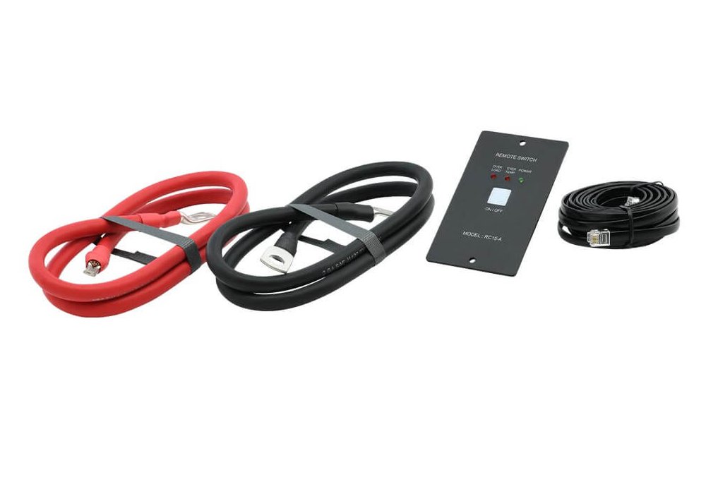Es wird eine Kabelfernbedienung mitgeliefert, sie können damit den Wandler Ein- bzw. Ausschalten. Wenn der Wandler über die Fernbedienung ausgeschaltet ist, wird nahezu kein Strom mehr verbraucht (<10mA). Die Kabellänge der Fernbedienung beträgt ca. 5 Meter.