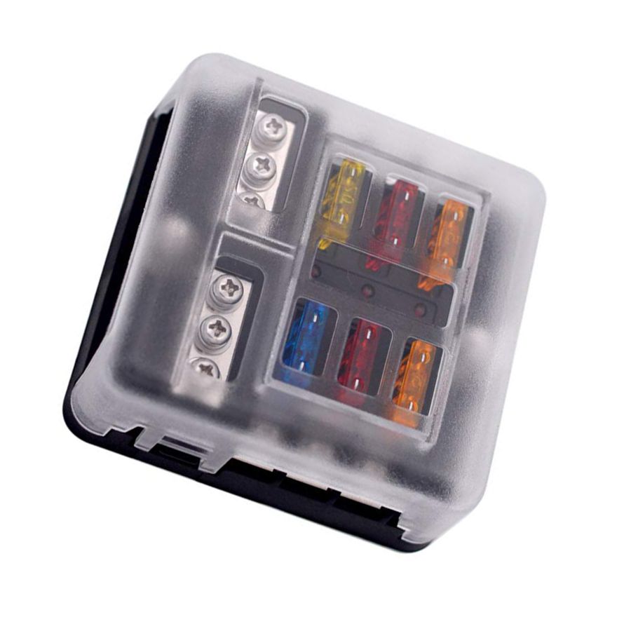 Der sechsfach KFZ Sicherungshalter ist für typische KFZ-Flachstecksicherungen (Typ ATO 19mm breit) ausgelegt. Es können entsprechend der gewählten Ausführung 6 oder 12 Leitungsstränge abgesichert werden. Die einzelnen Leitungsstränge jeweils bis 30A, wobei die Gesamtstrombelastbarkeit des Sicherungshalters bei 100A liegt. Die Zuleitung wird über einen Schraubanschluss (M5 Gewindebolzen mit Mutter) am Halter befestigt. Die einzelnen Abgänge von den Sicherungen sind als Schraubanschluss für M4 Ringkabelschuhe ausgeführt.